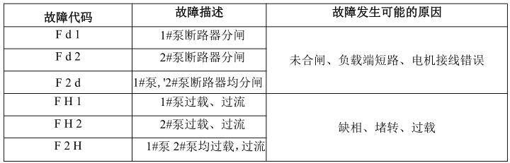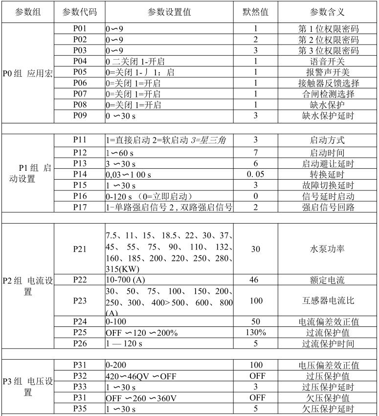 當數顯屏顯示 P01 參數代碼時,按《2 泵啟動》鍵與《2 泵停止》鍵可以找出其它參數代碼,當按《1 泵停止》鍵進入該參數的當前設置值,通過按《2 泵啟動》鍵與《2泵停止》鍵進行修改,再通過按《主 /備選擇》鍵返回到當前參數代碼。設置完所有的參數需按《主/備選擇》鍵退出到待機狀態,才會永 久保存修改過的參數。